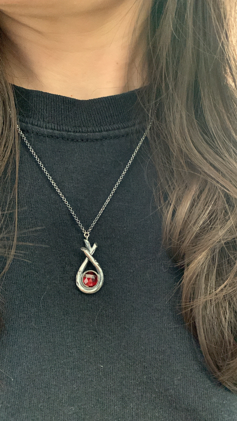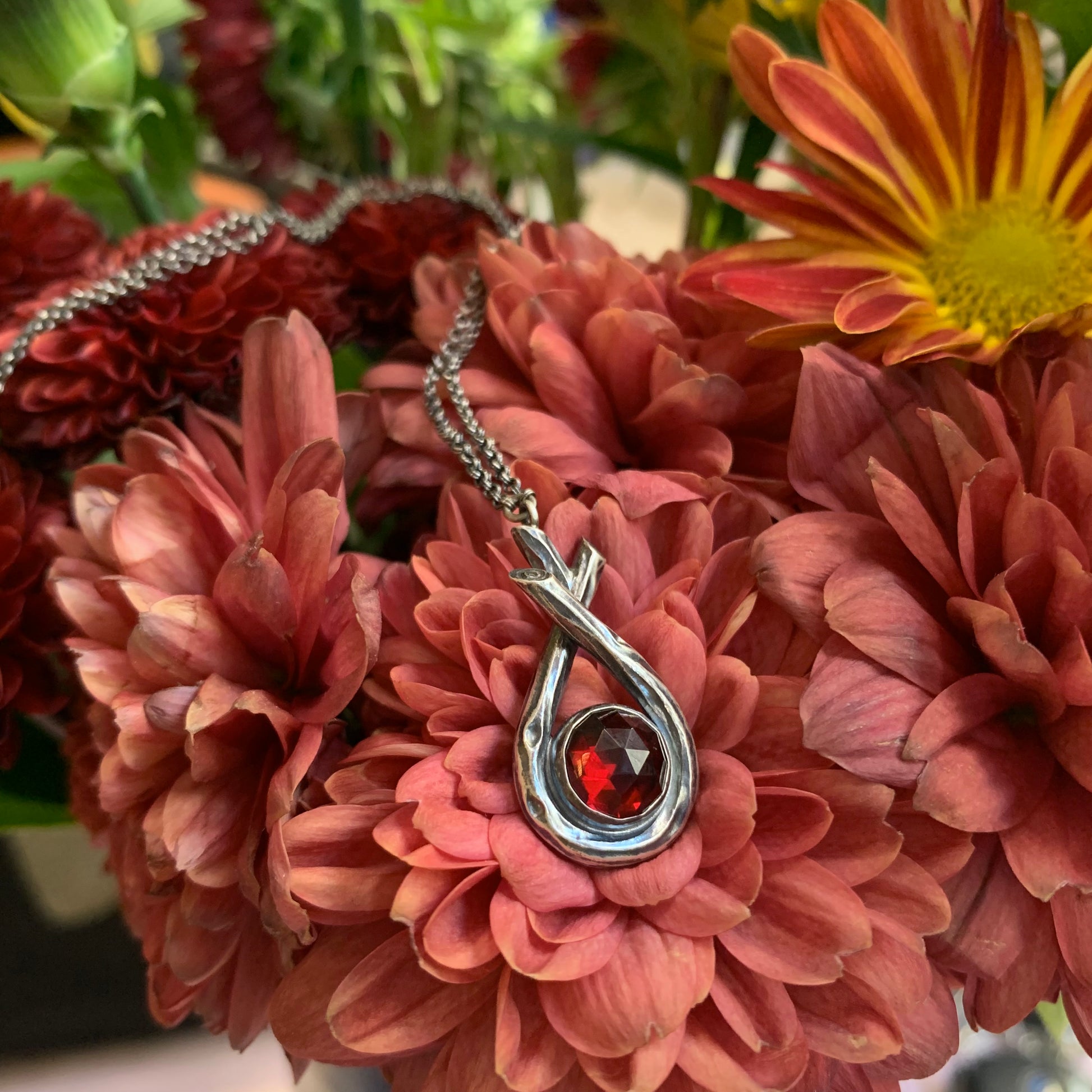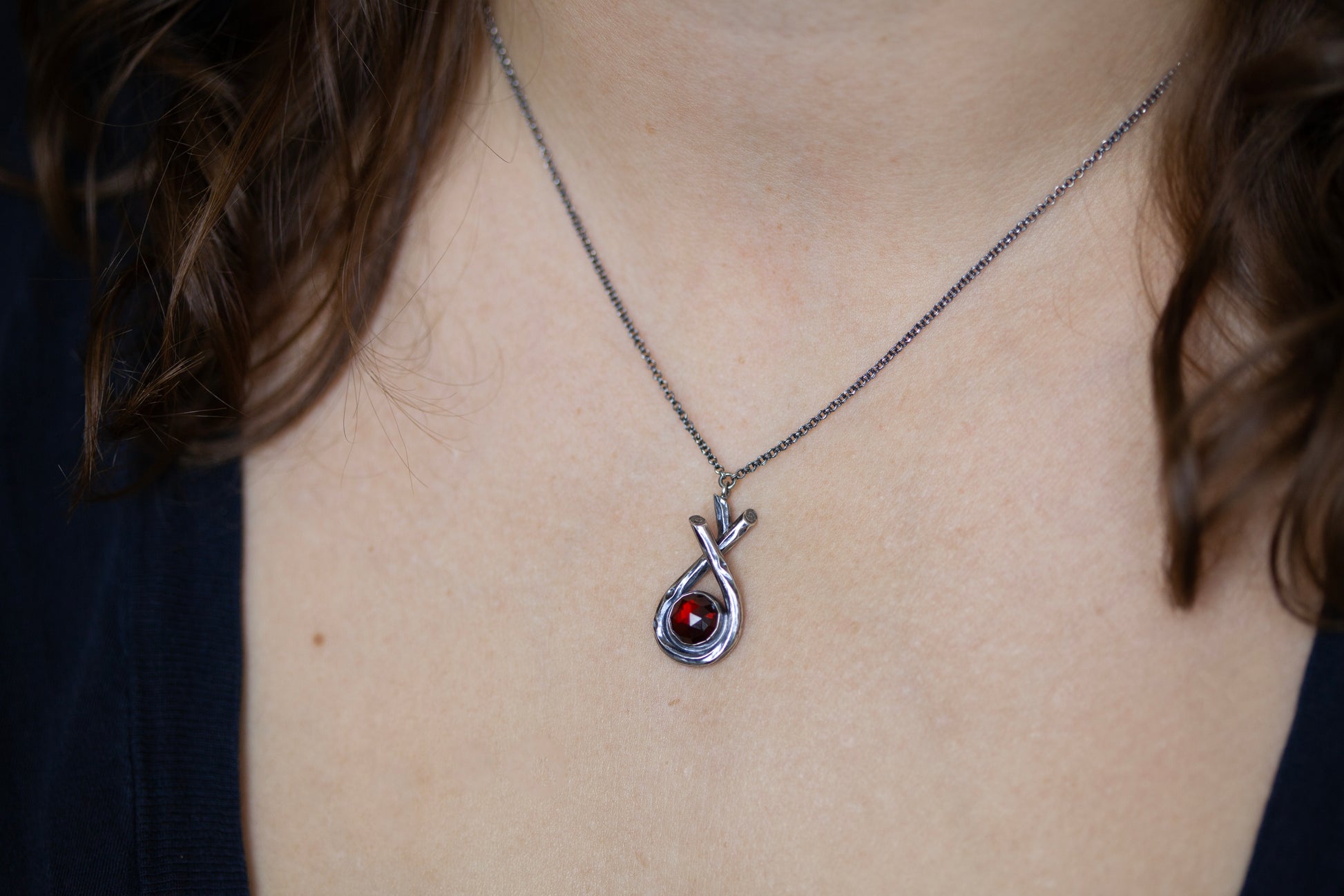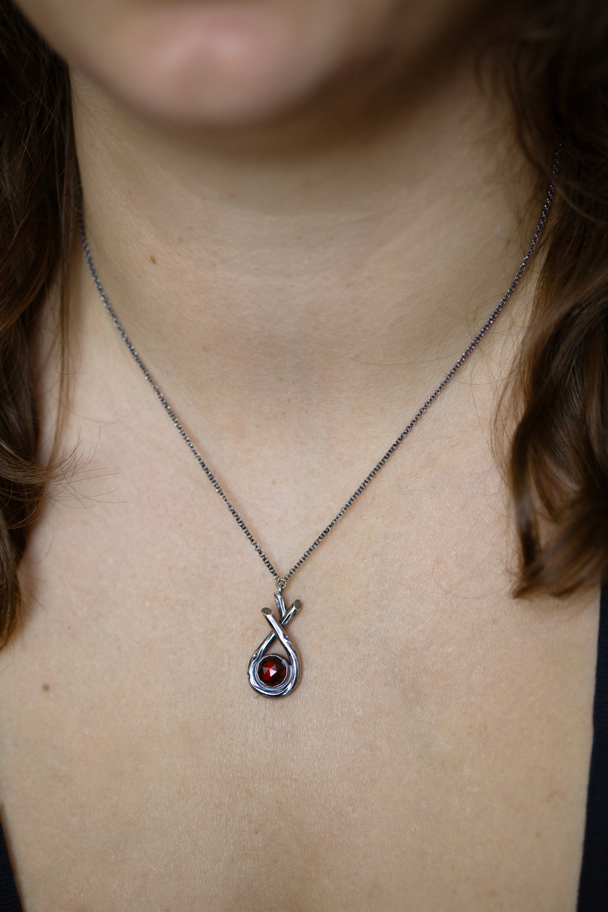 Each of these necklaces features a sterling silver pendant made of wire and carved with a woody branch texture bent and twisted into different shapes that compliment the unique, sparkling rosecut stone it cradles. The pendant is fixed on a sterling silver chain with TTJ hook & loop clasp.