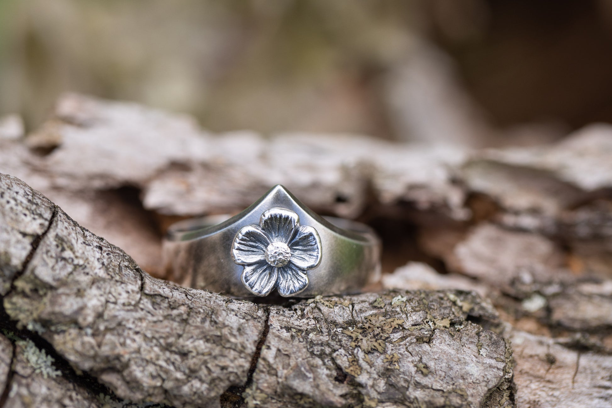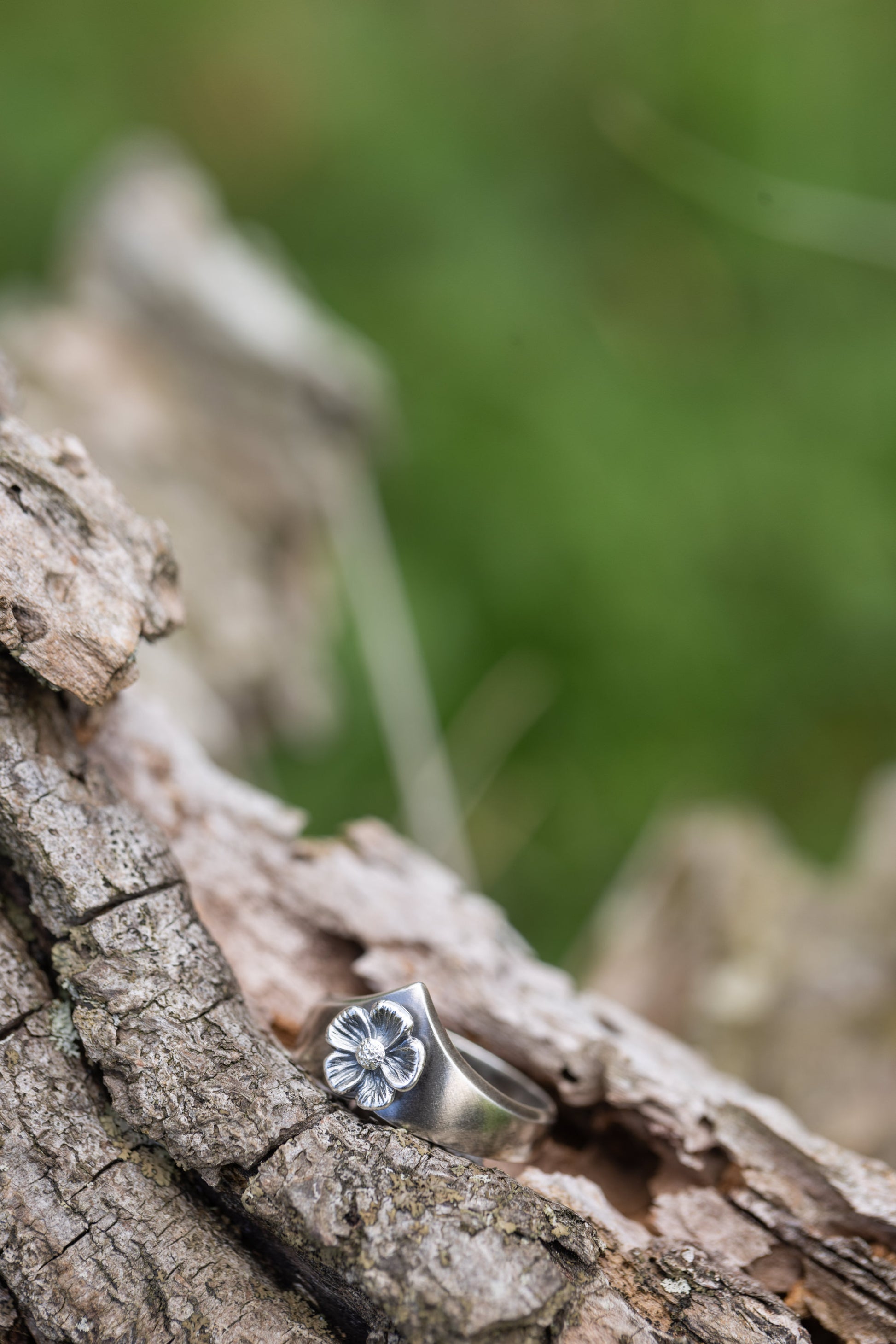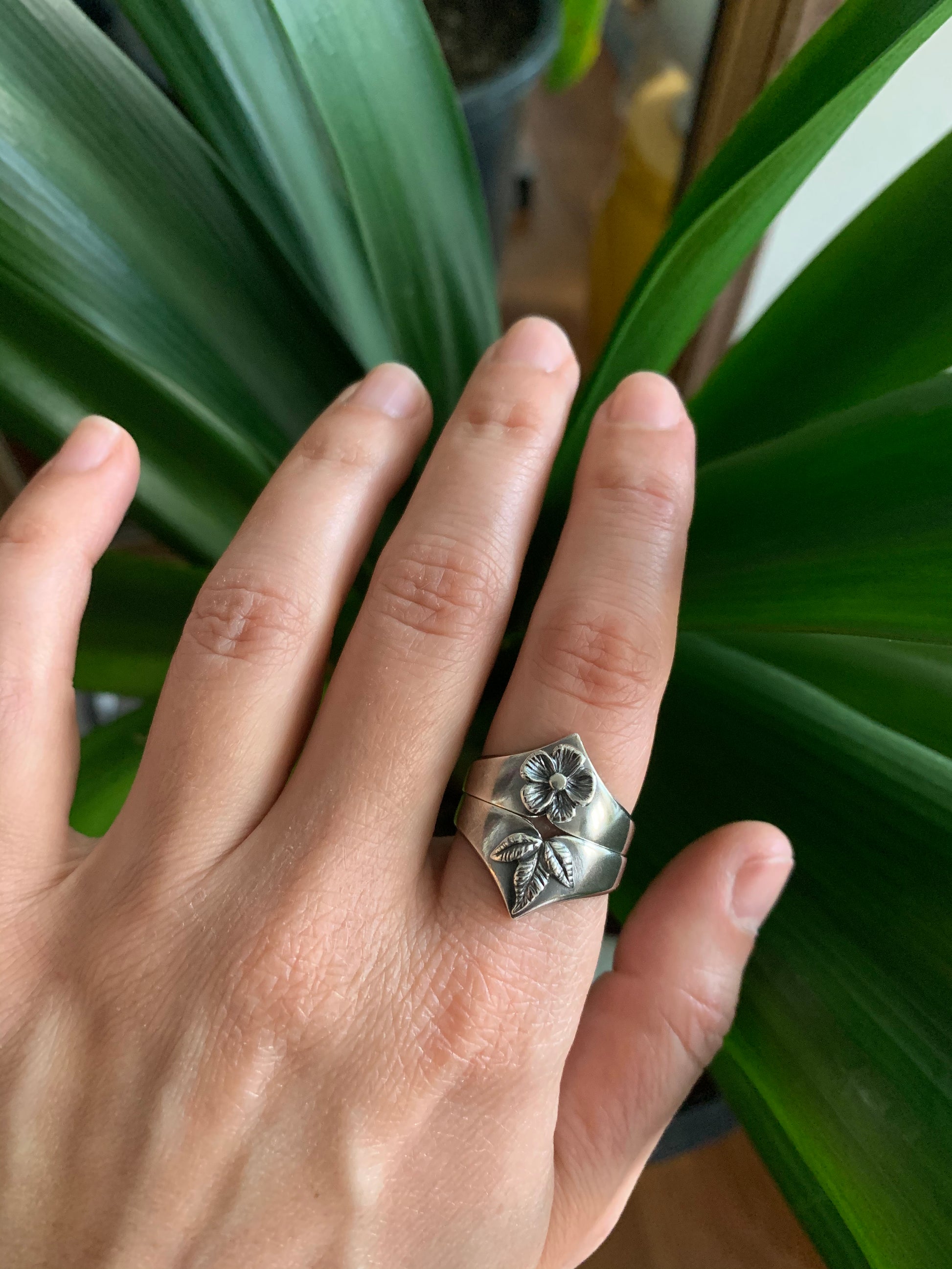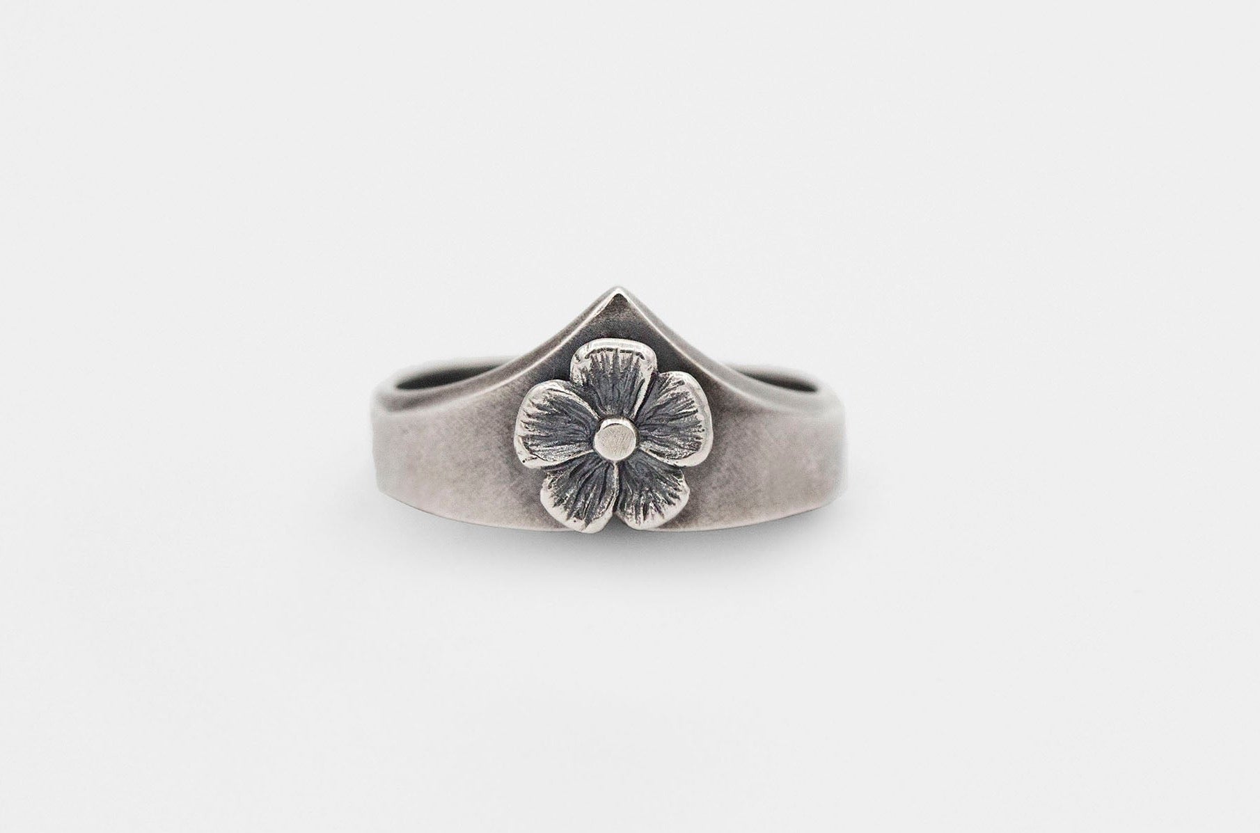 This powerful, shield-like ring features a five petal flower carved in relief. Created in sterling silver, the ring is oxidized/darkened in the recesses to show off intricate detail. Pair the Amulet Ring easily with other bands of different textures like the Thin Wreath Band or Amulet Leaf Ring (pictured).