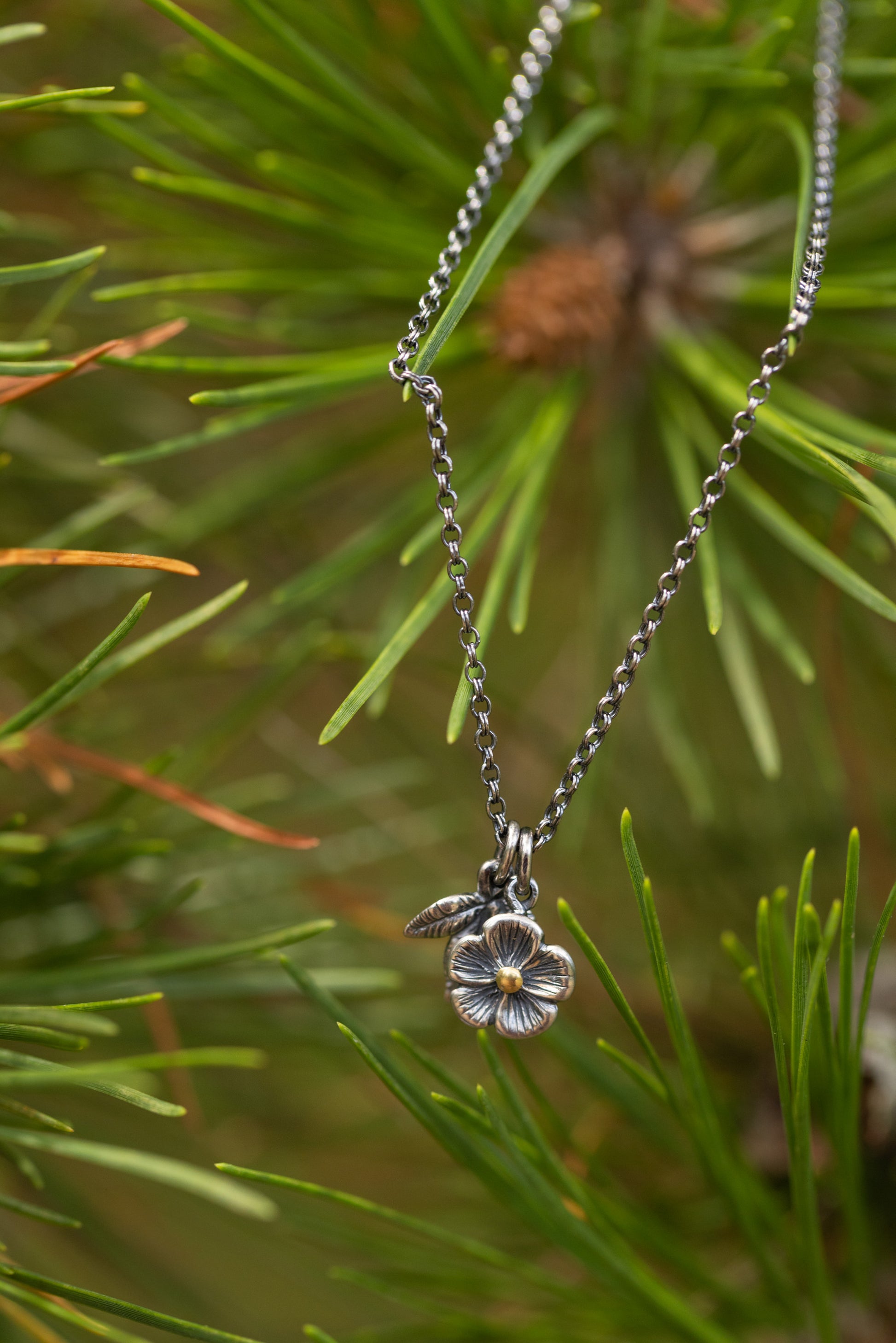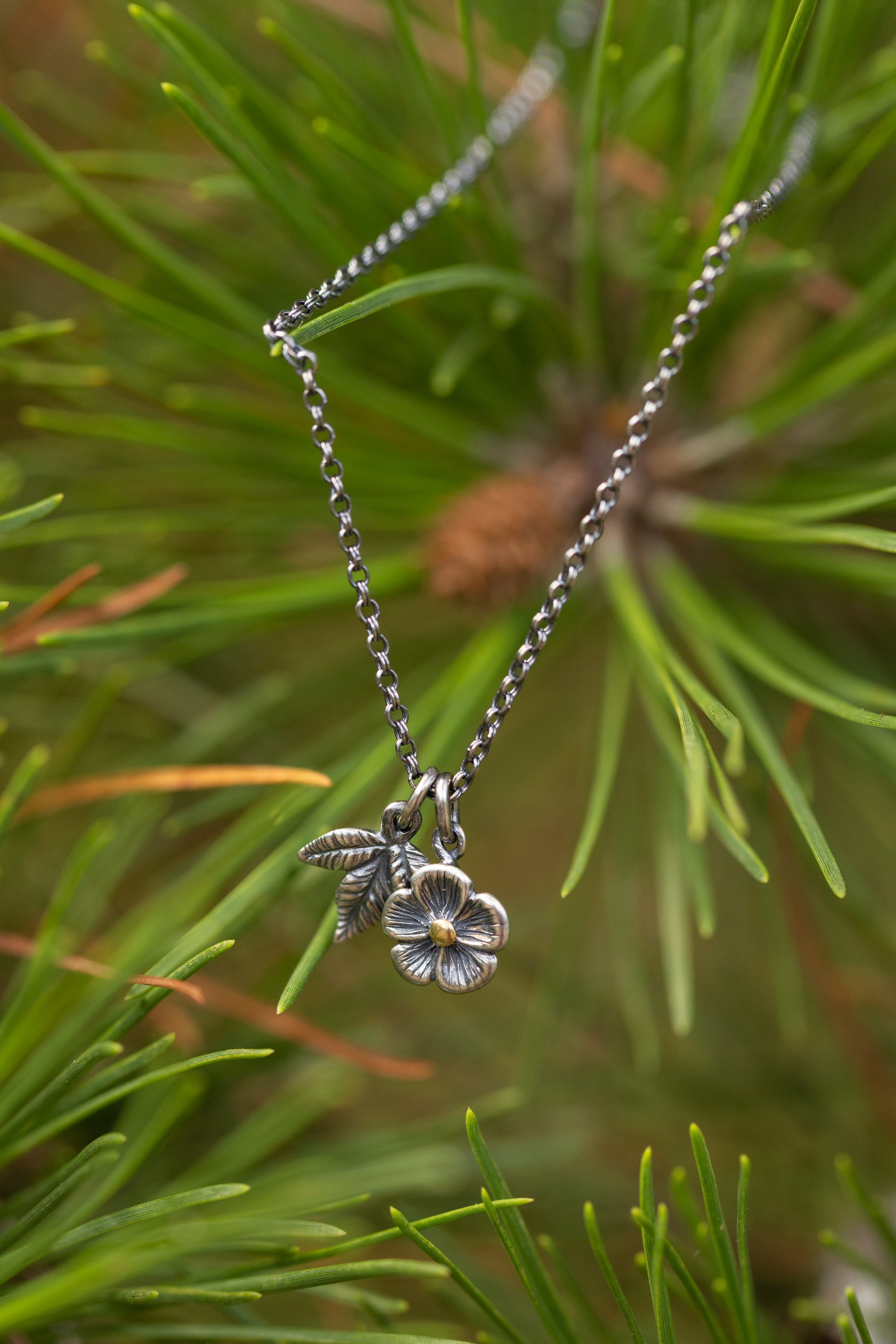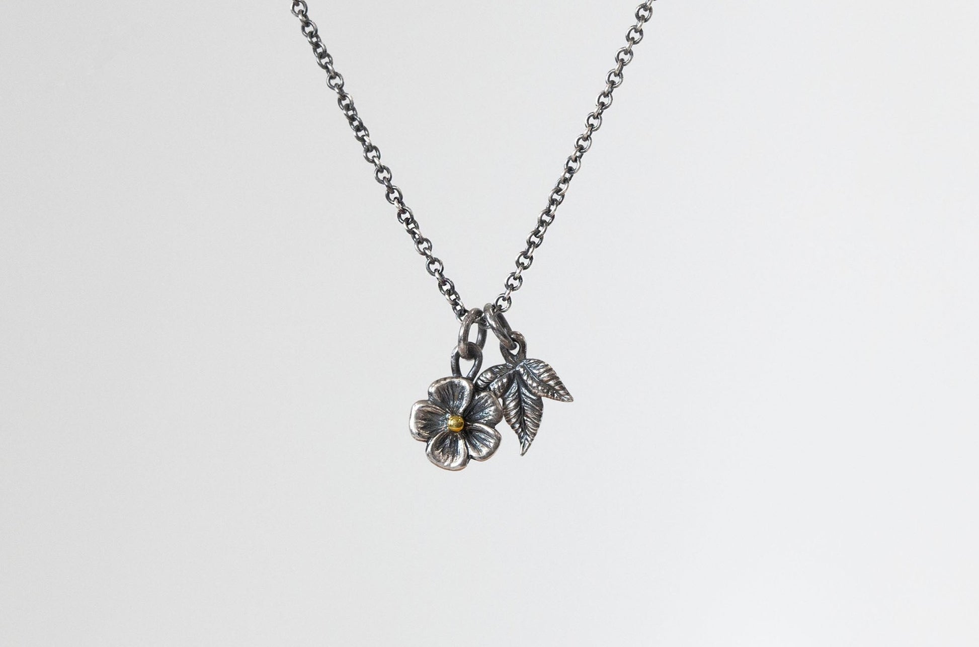 A detailed, hand-carved Buttercup Charm (with 22K yellow gold center) and Leaflet Charm are paired together on a dainty but strong silver chain with a unique TinyJeweler hook & loop clasp.
