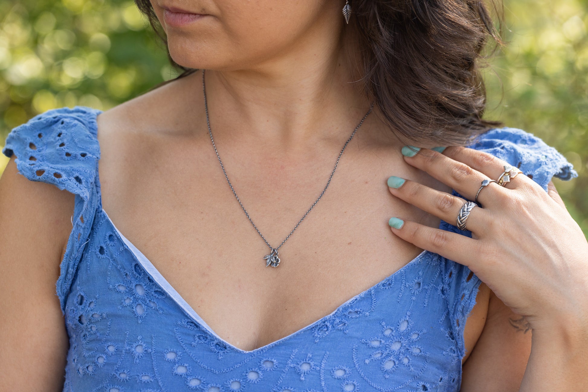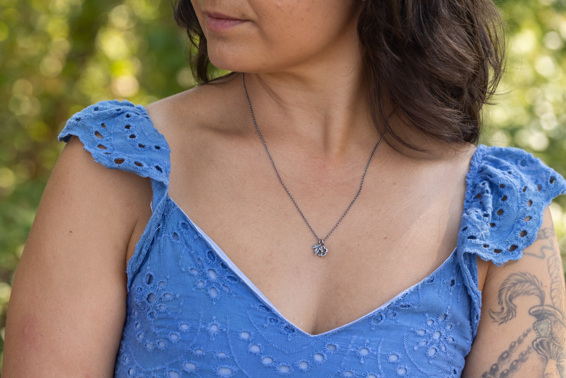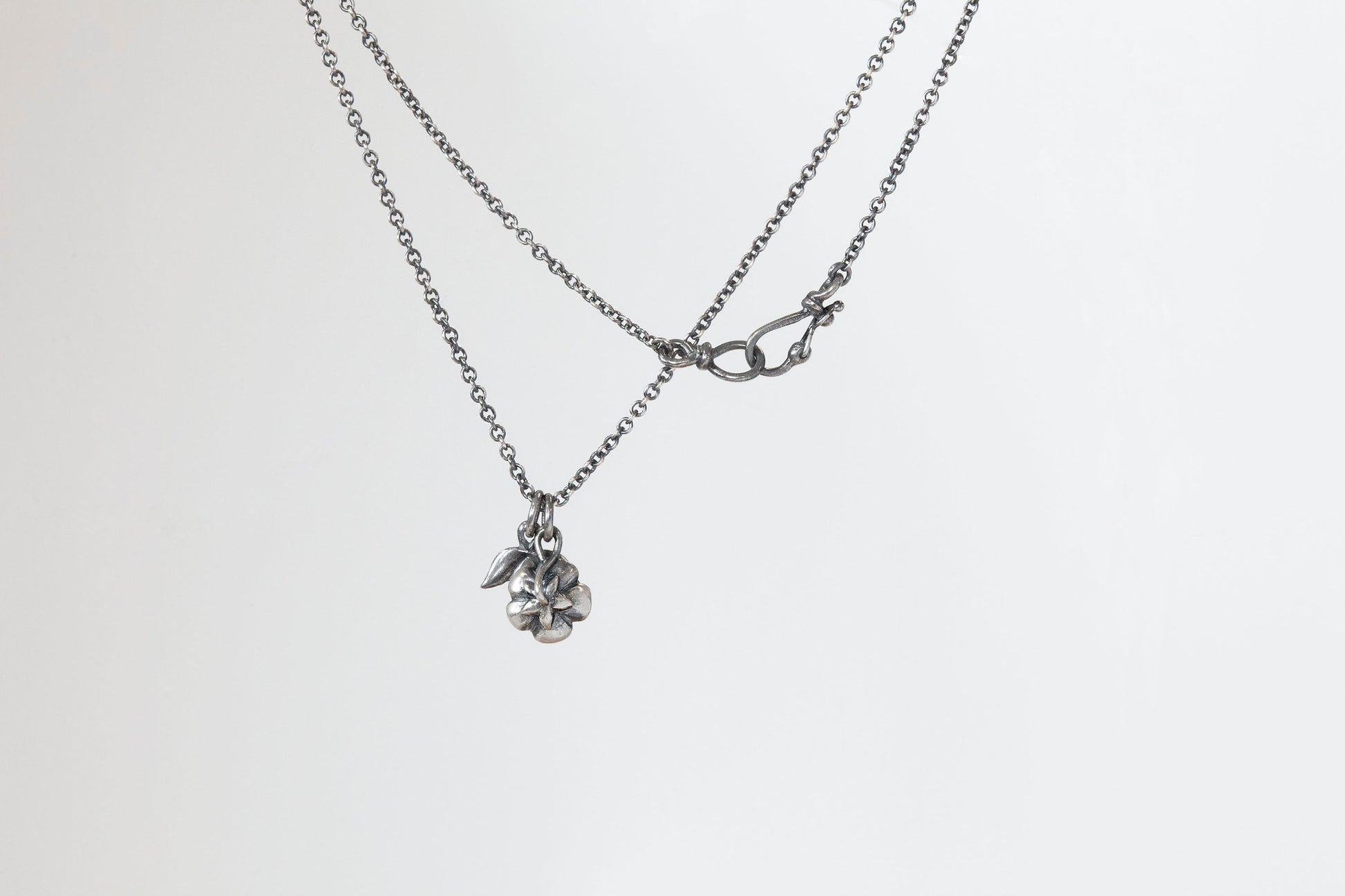 A detailed, hand-carved Buttercup Charm (with 22K yellow gold center) and Leaflet Charm are paired together on a dainty but strong silver chain with a unique TinyJeweler hook & loop clasp.