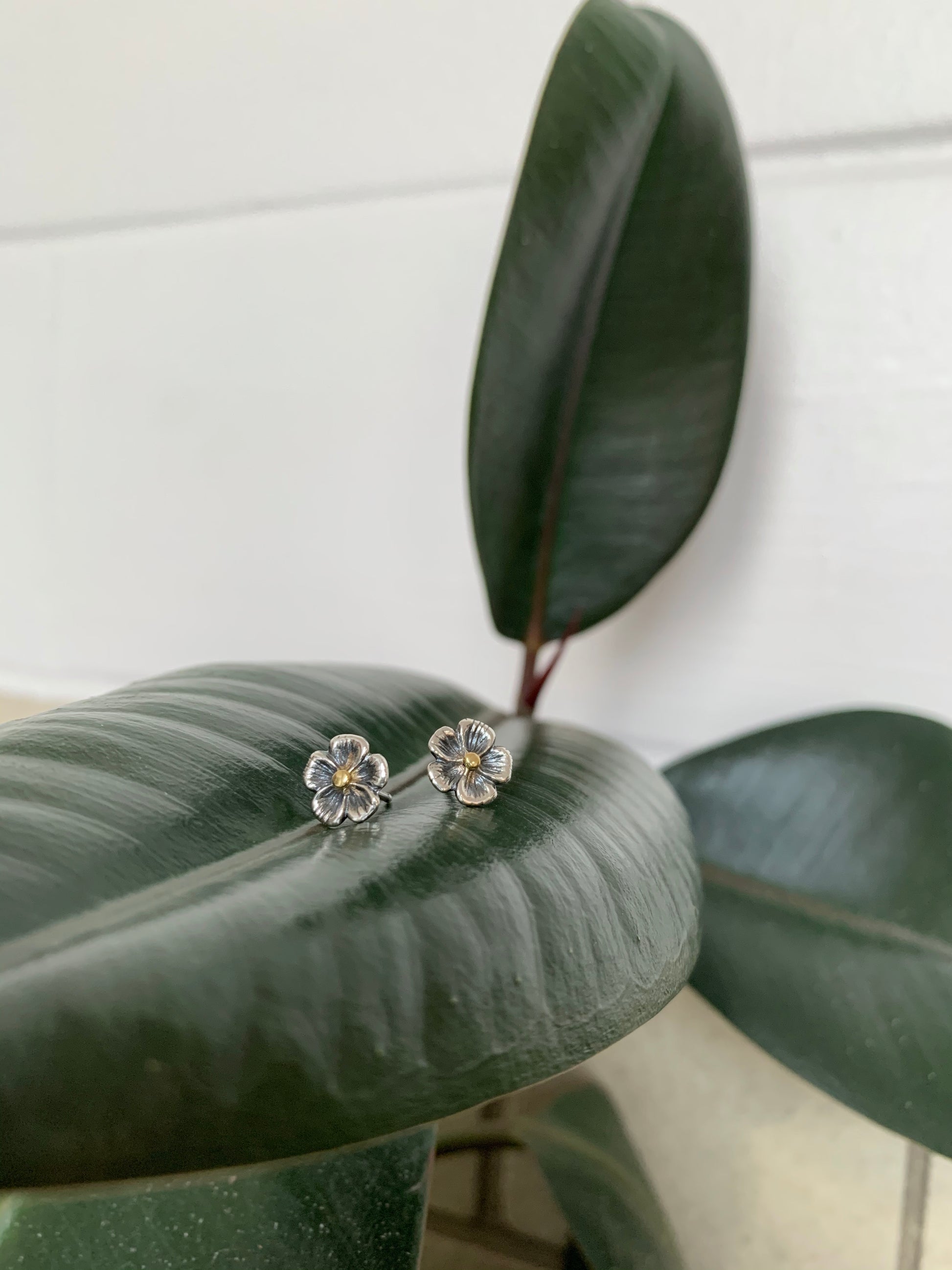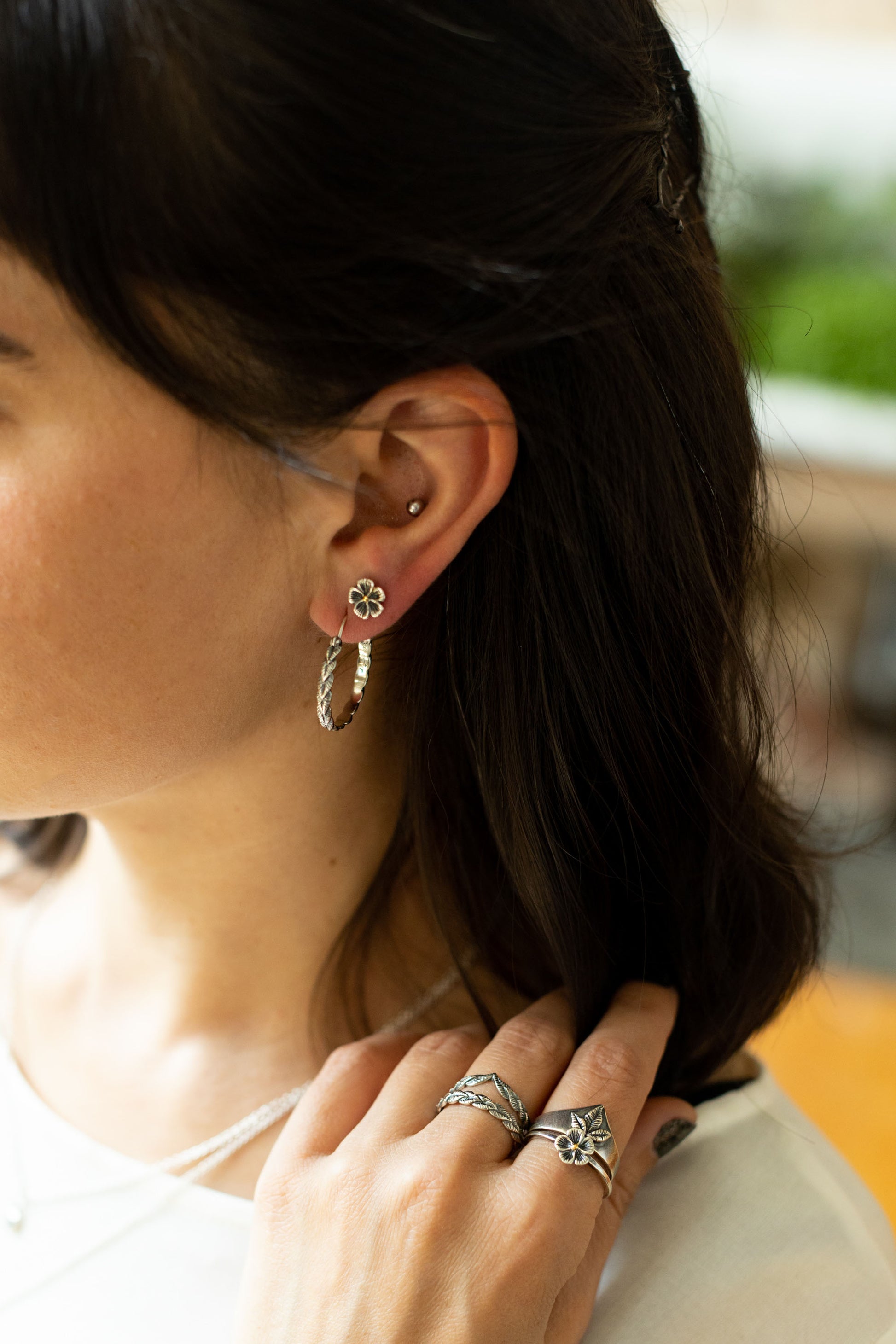 These hand-carved sterling silver buttercup studs, made with a 22K yellow gold center, are perfect as everyday stud earrings… I rarely take mine off! Try wearing them alone or in a second earlobe piercing to accent hoops or drops.