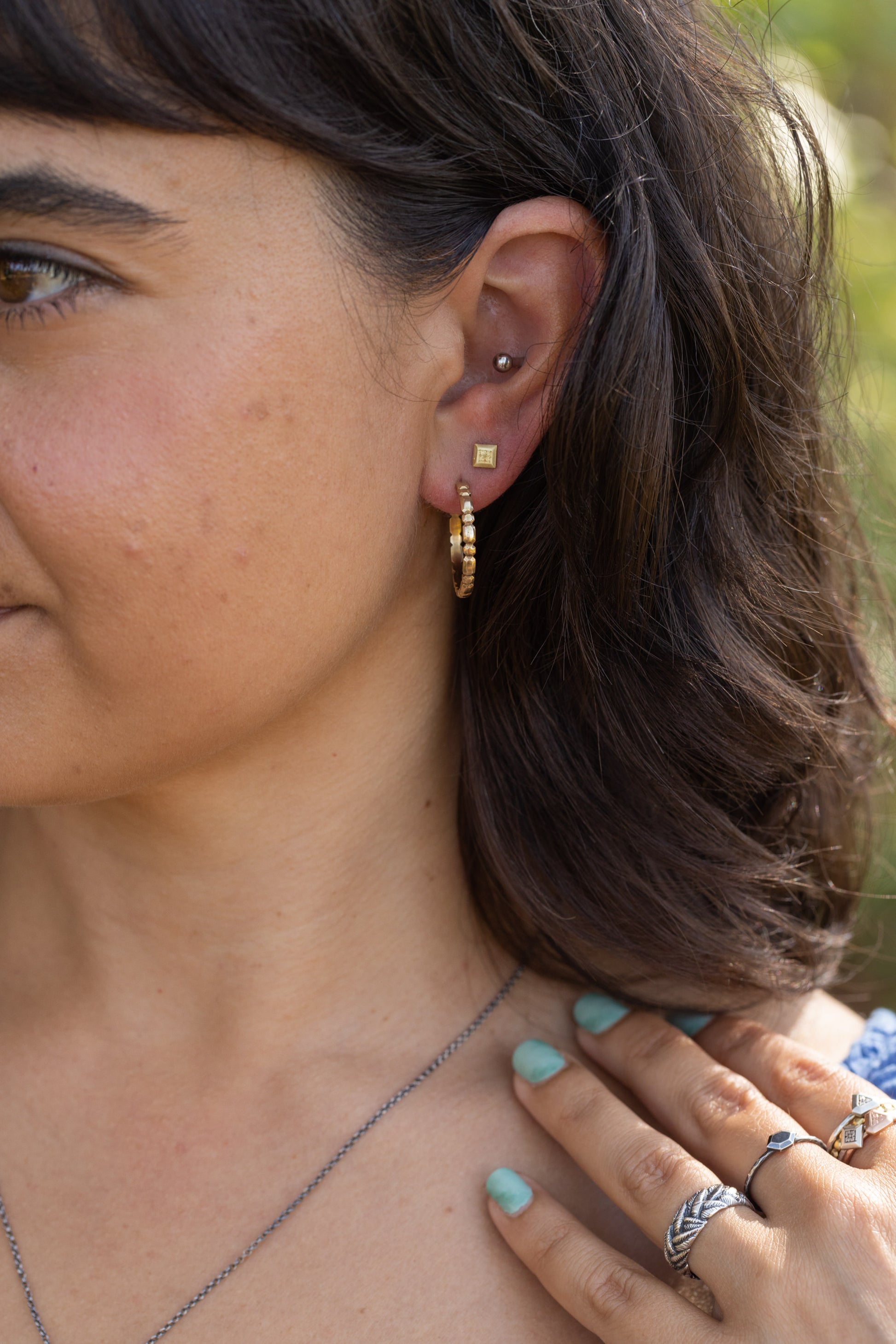Experience everyday elegance with the Mini Signet Studs. Whether you wear them solo or pair them with hoops or dangle earrings, these hand-crafted studs feature intricate flower or star engravings, adding texture, sparkle and a touch of nature imagery to your look.