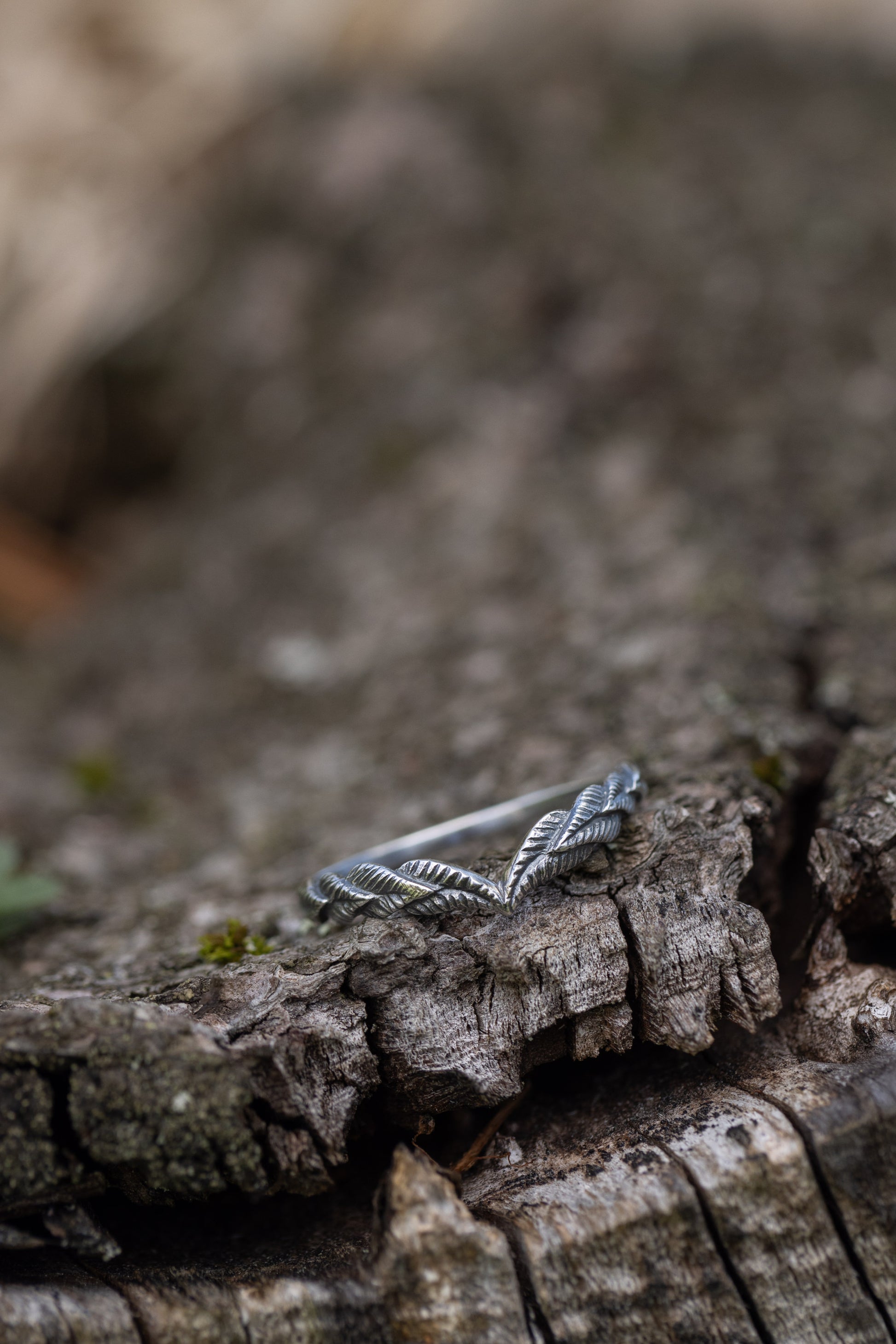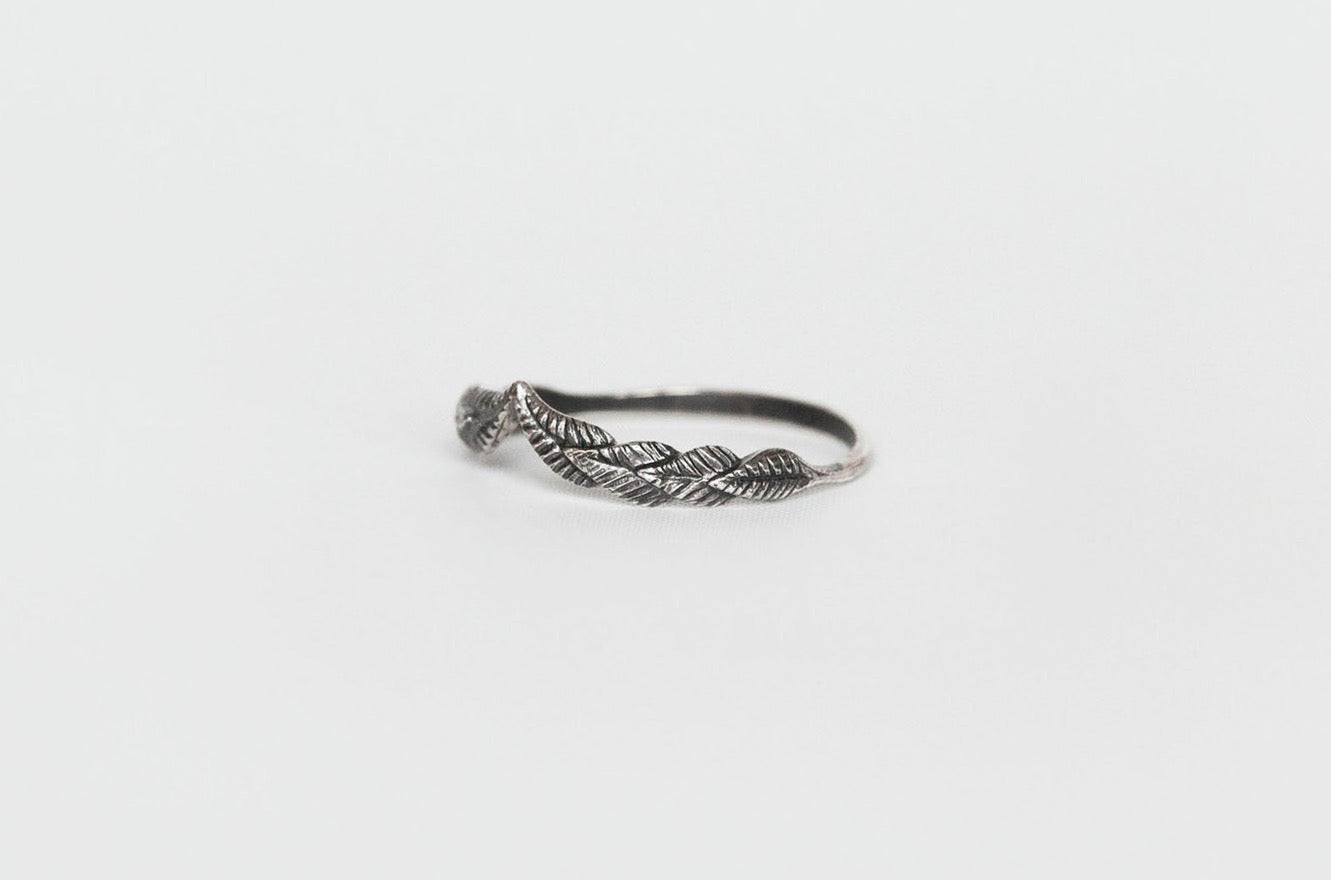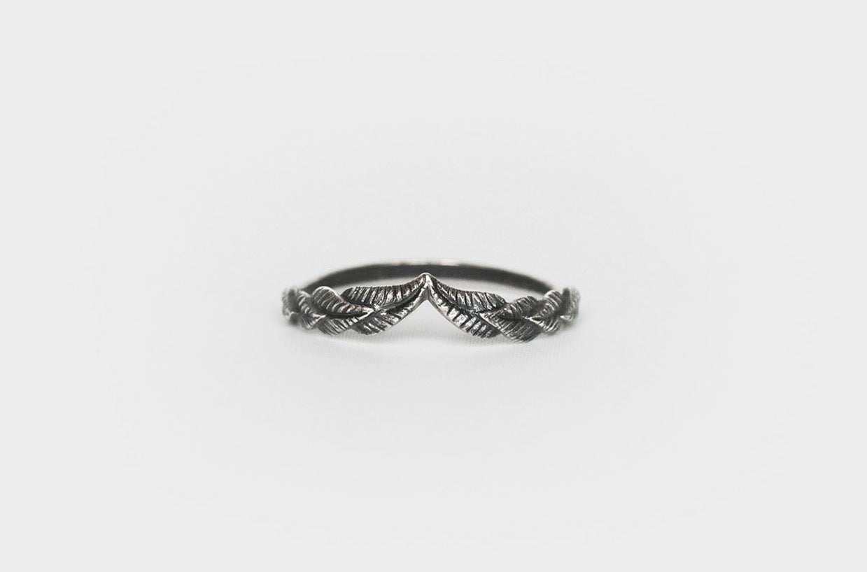 This simple, yet detailed ring is perfect for the outdoorsy type who also appreciates the finer things in life. The Curved Leaf Band features two intricately hand-carved lines of overlapping leaves that meet in the center forming a small "V" shape. It poetically encircles the finger to keep a memory of nature with you all the time.