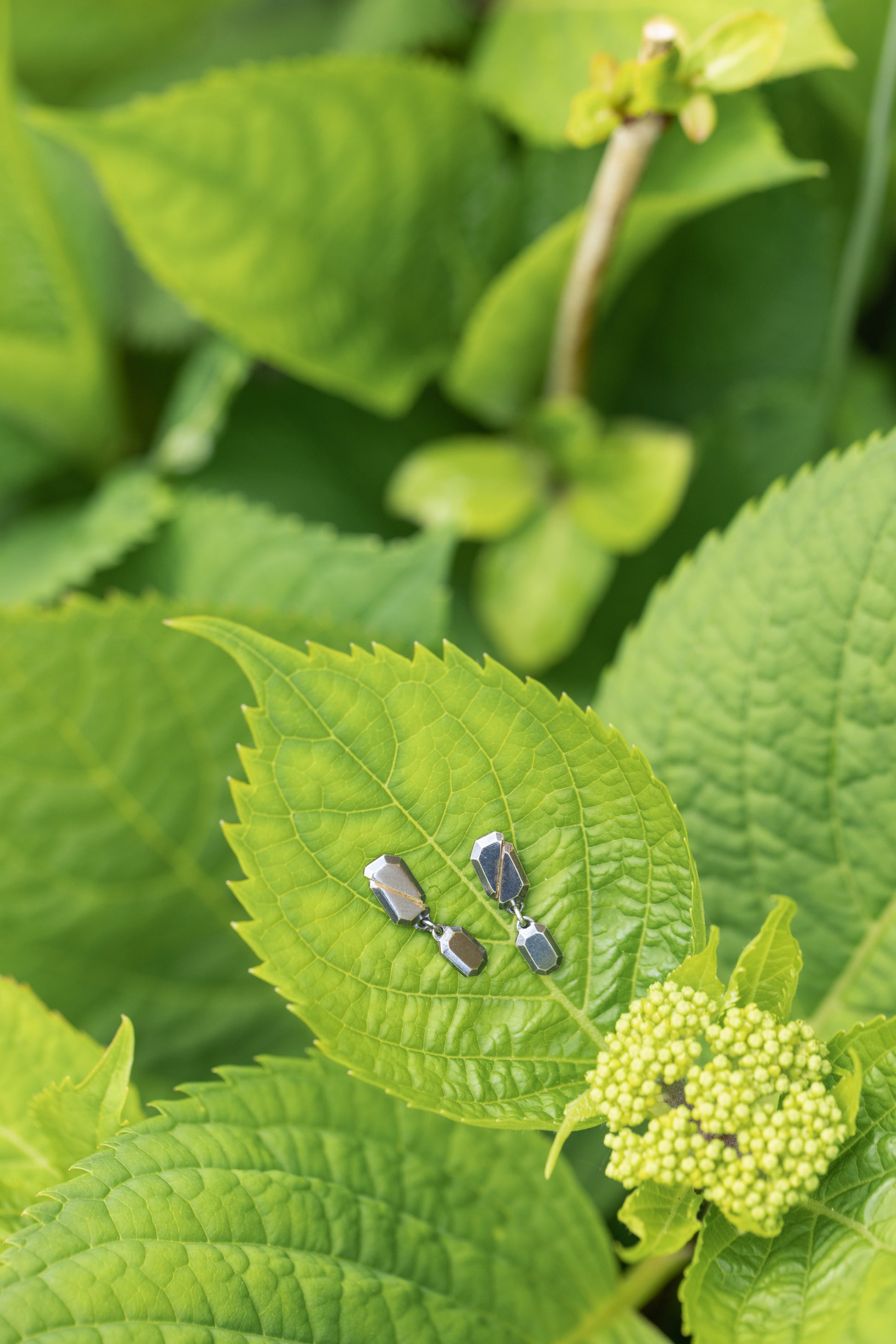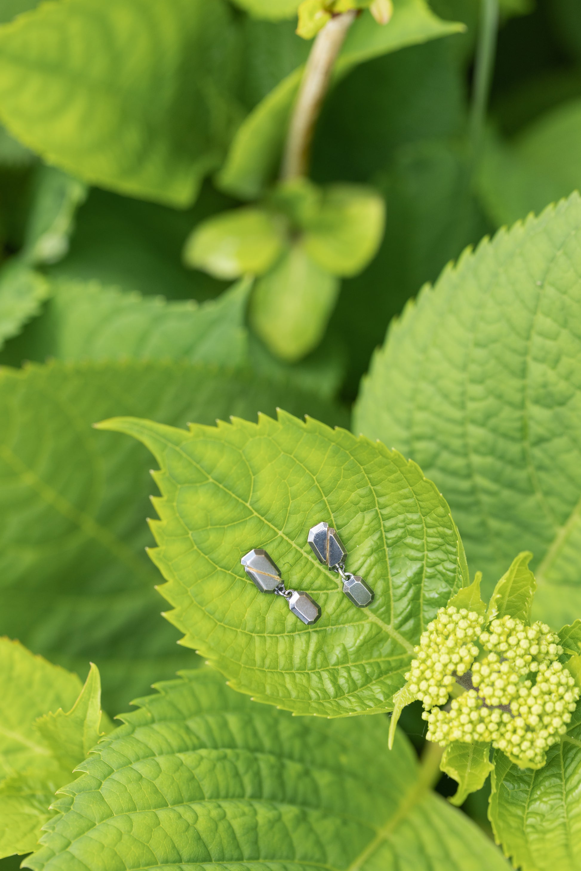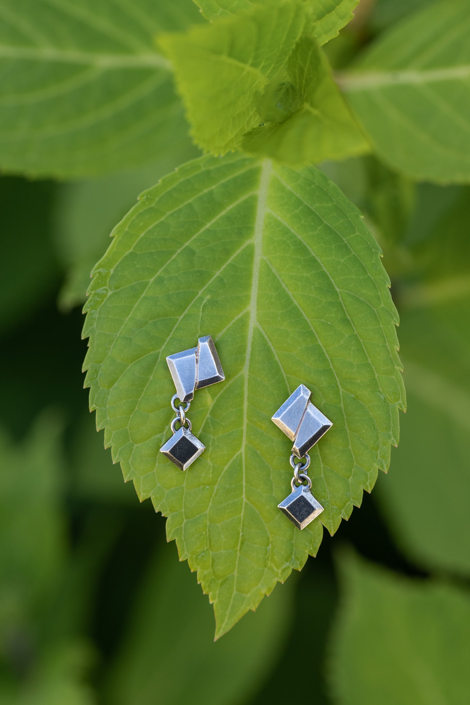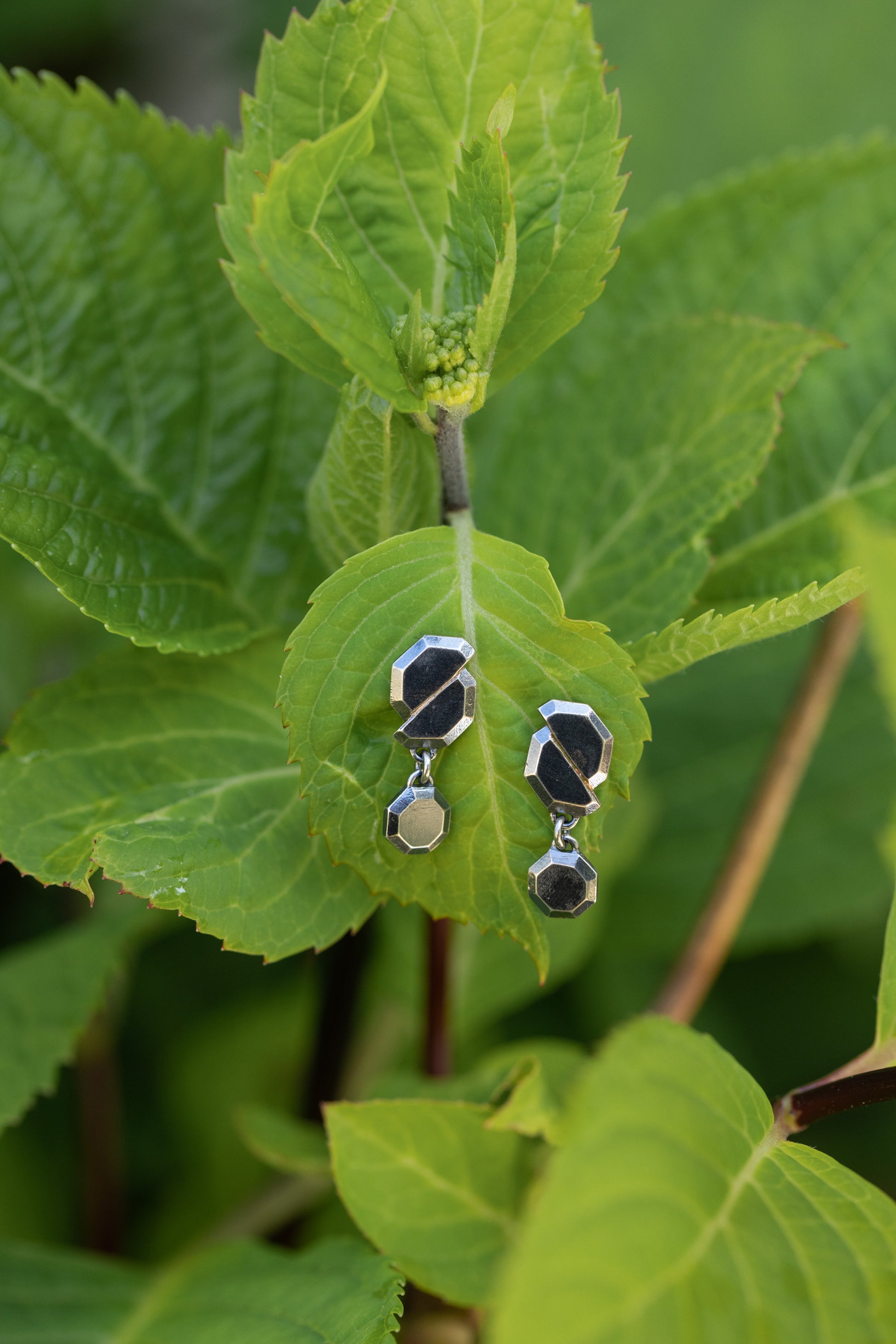 These one-of-a-kind drop earrings were created as part of a limited edition group of seven. Inspired by the power of natural forces and changing landscapes, the Fault Line Earrings are hand-fabricated in sterling silver and are a sophisticated, unique design for every day. A beveled oxidized silver octagon shape was created, cut in half, shifted askew and soldered back together with gold solder, highlighting the shift*. Adding a unique and delicate touch, a smaller version of the shape hangs suspended below. These unique earrings elevate any look to luxurious heights.