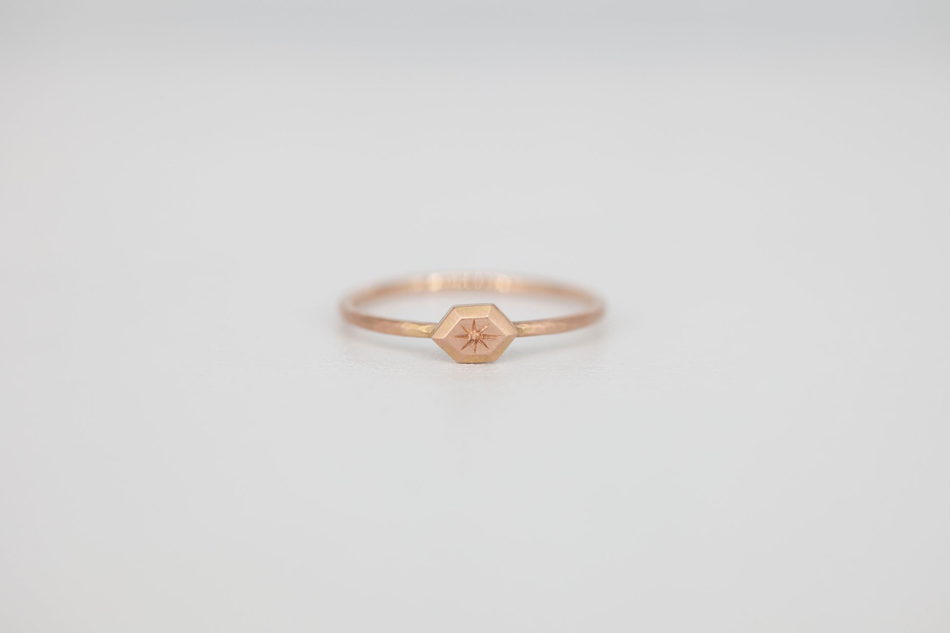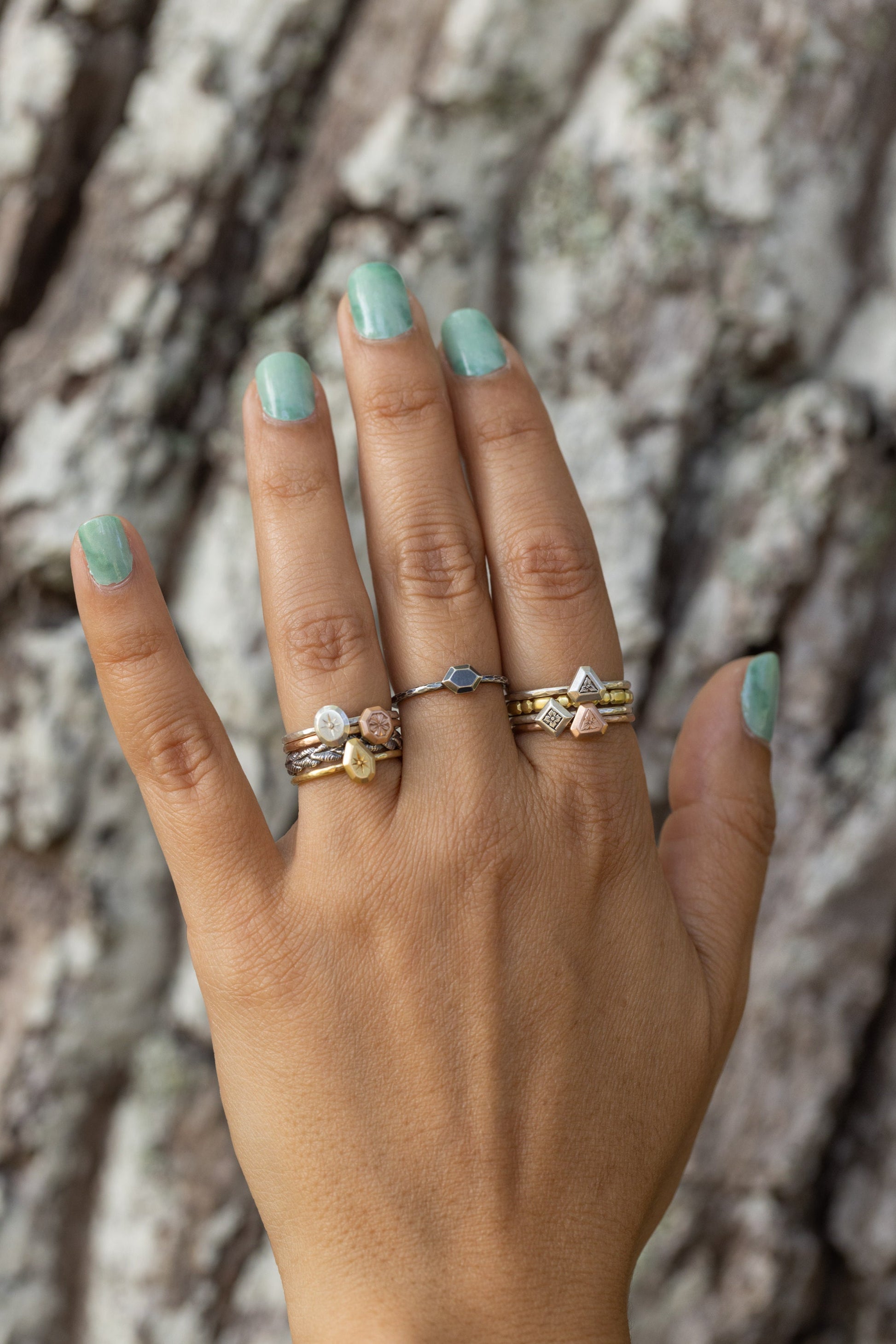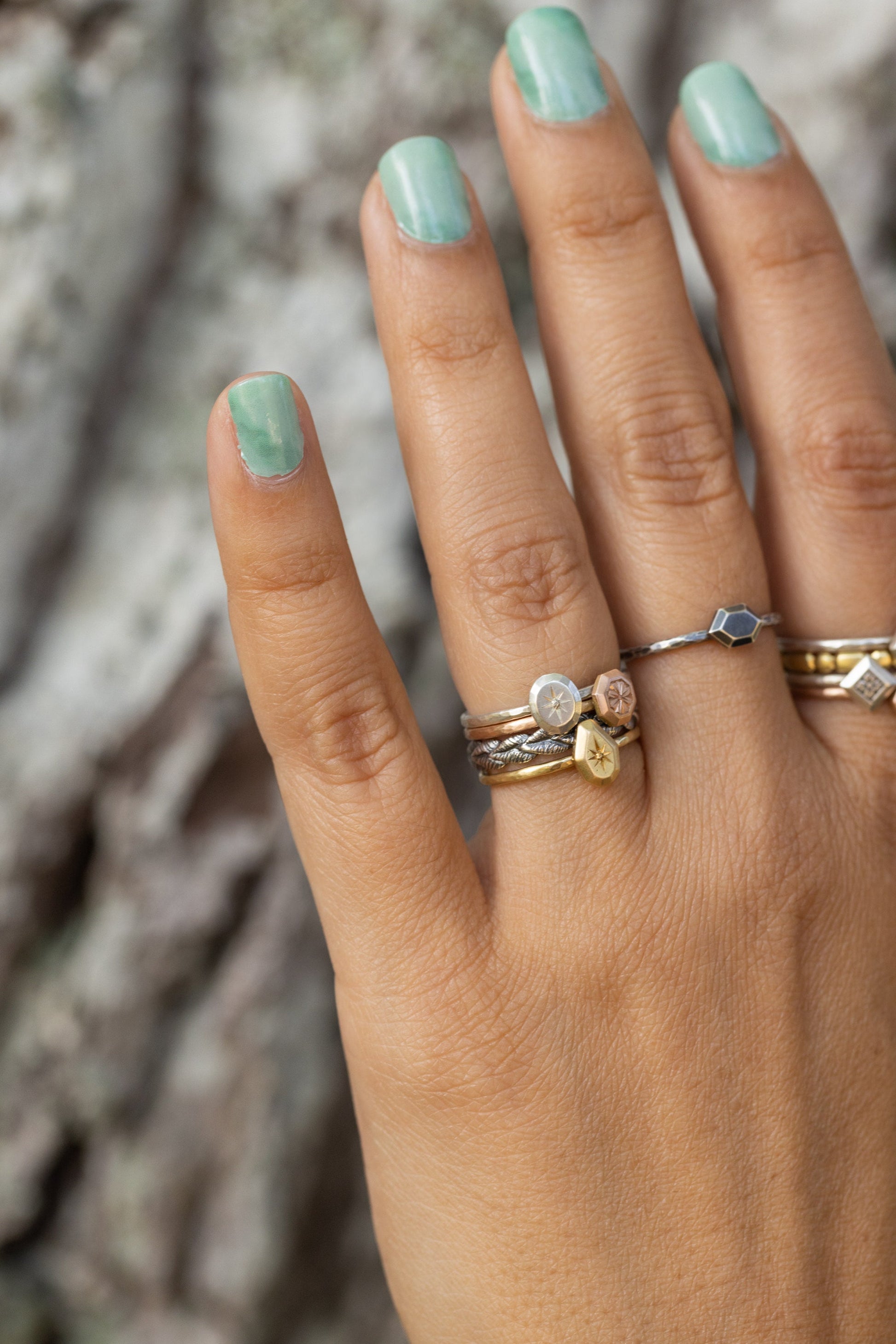 These stackers all have the same hammered band and you can choose between (7) shapes for the top face. Each ring has either a hand-engraved star or flower, depending on its shape.