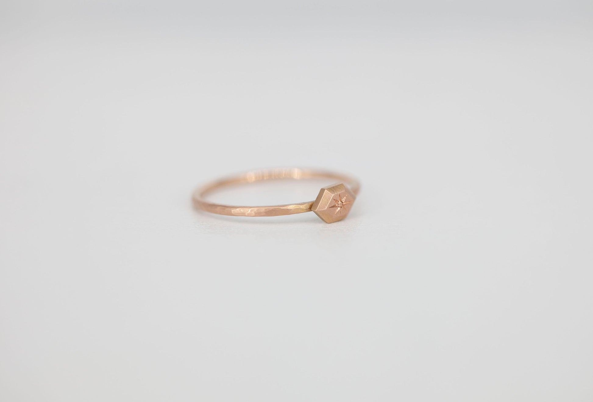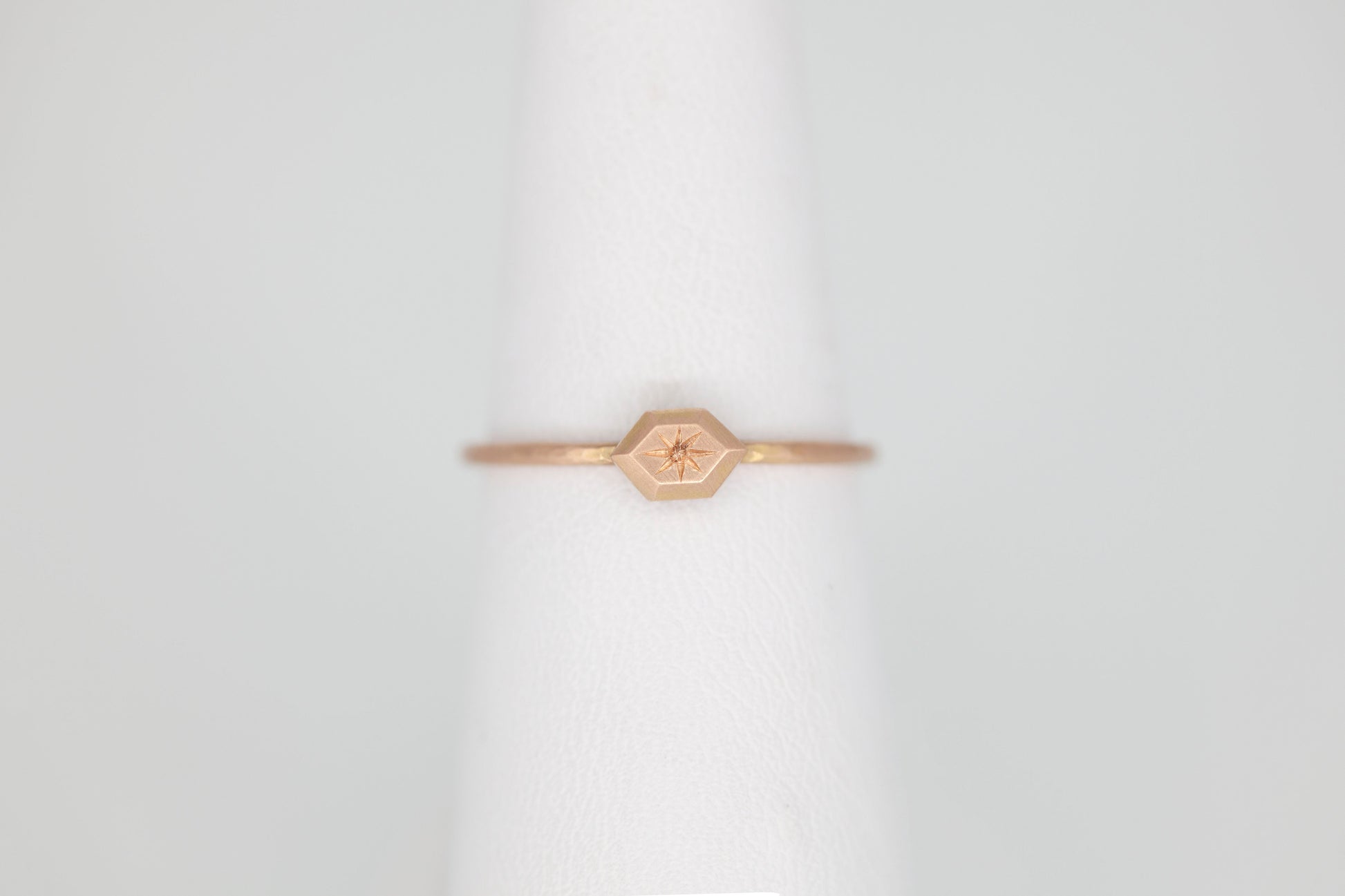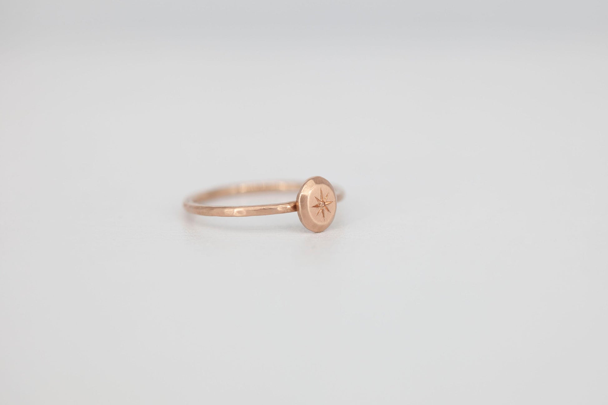 These stackers all have the same hammered band and you can choose between (7) shapes for the top face. Each ring has either a hand-engraved star or flower, depending on its shape.