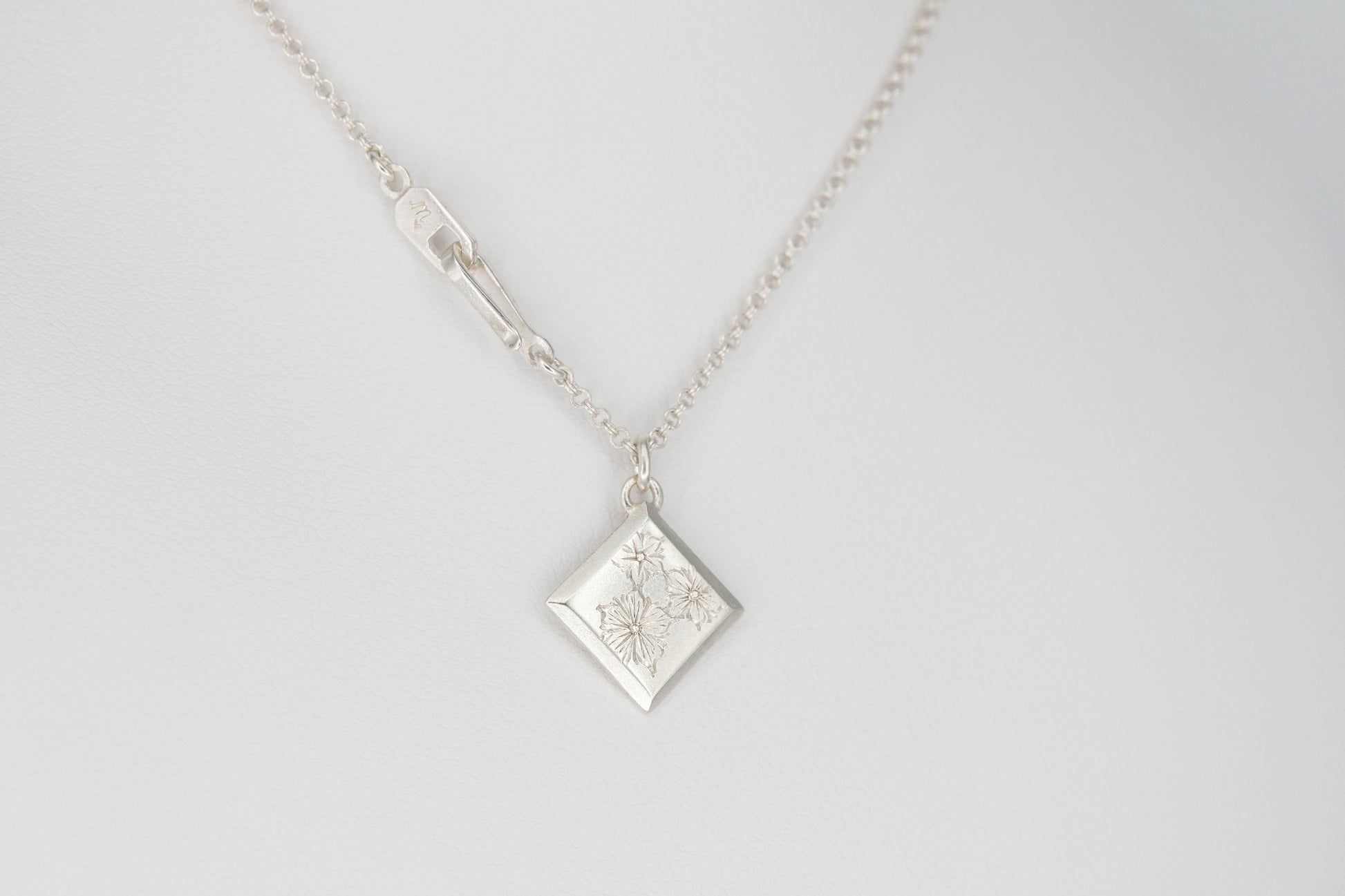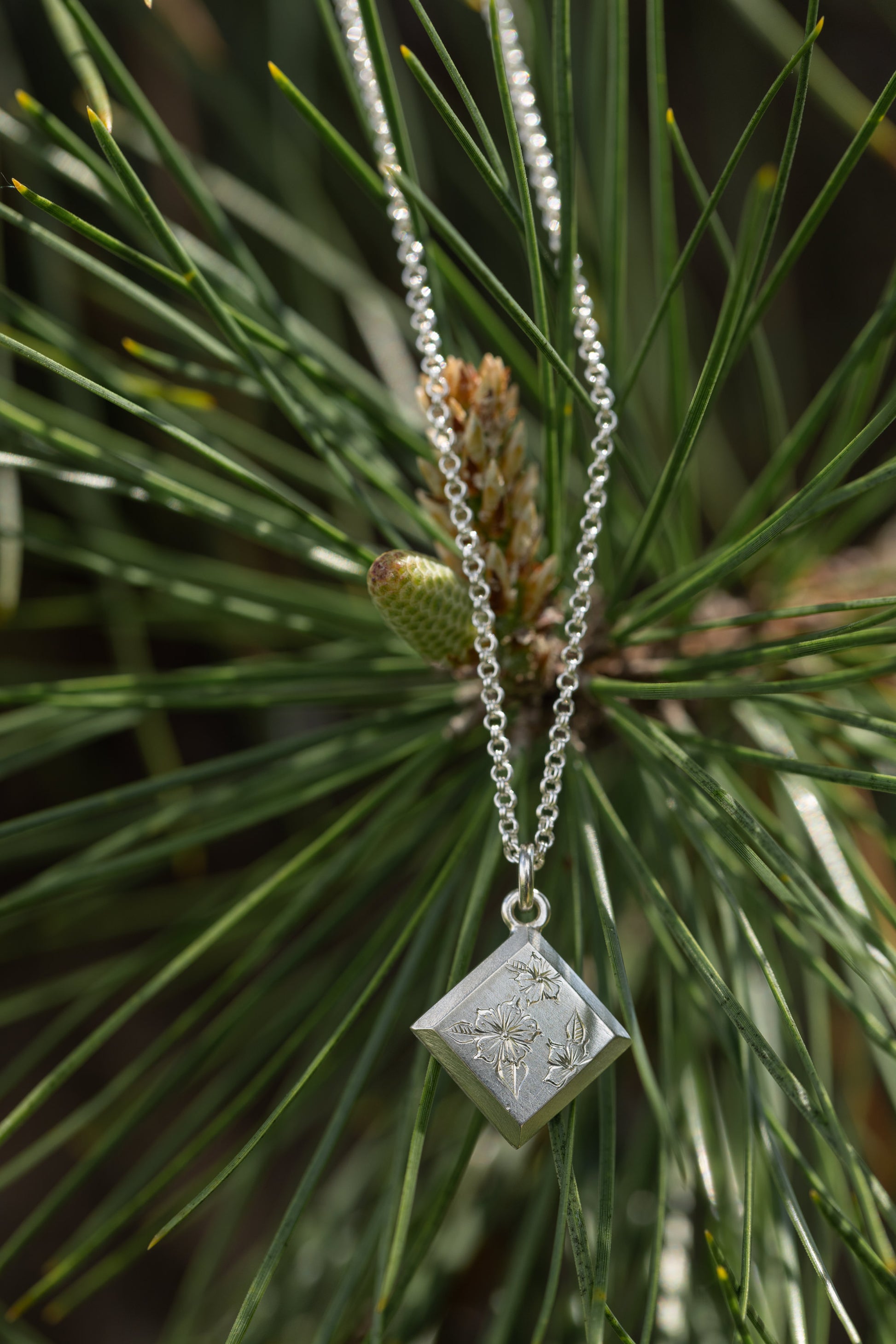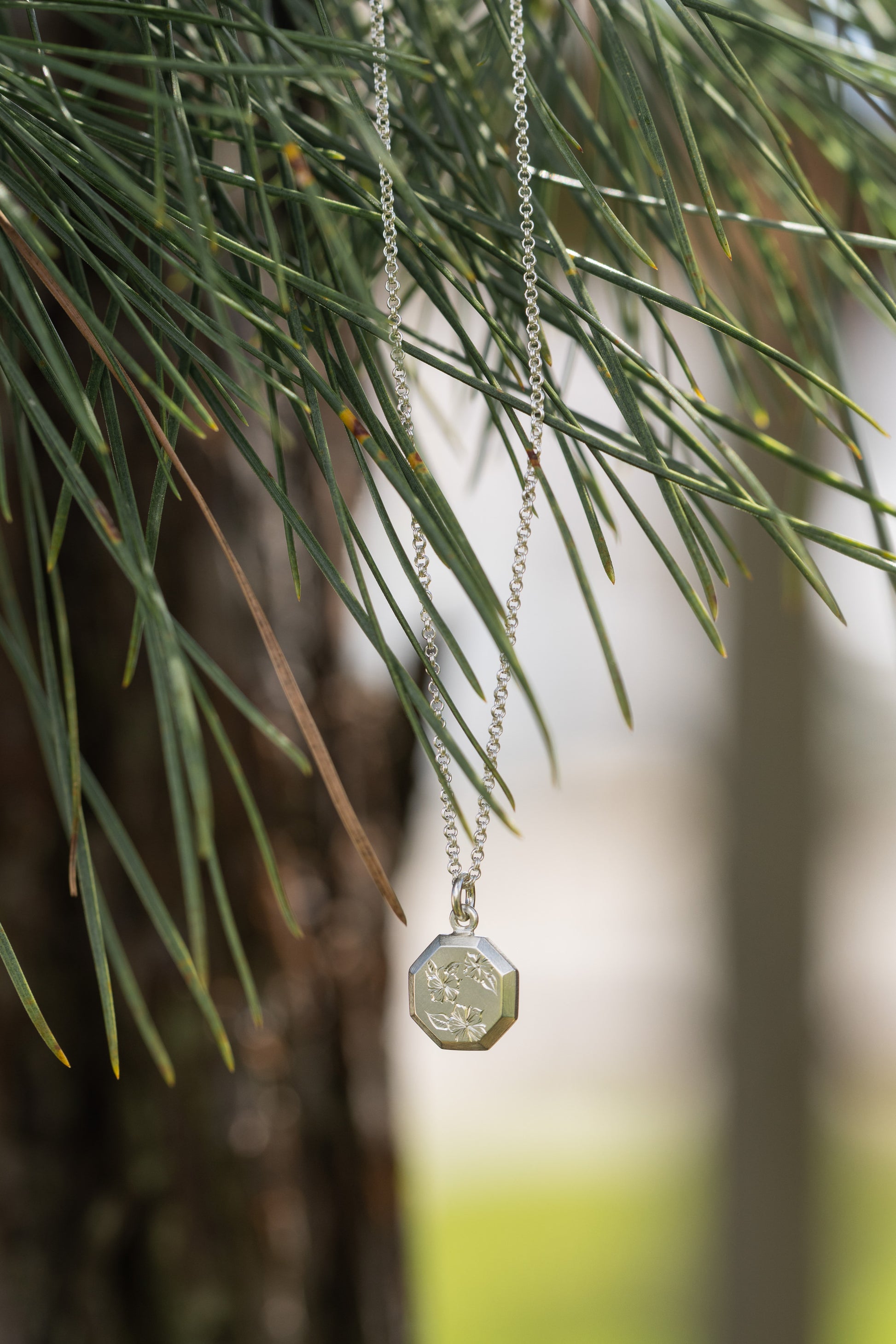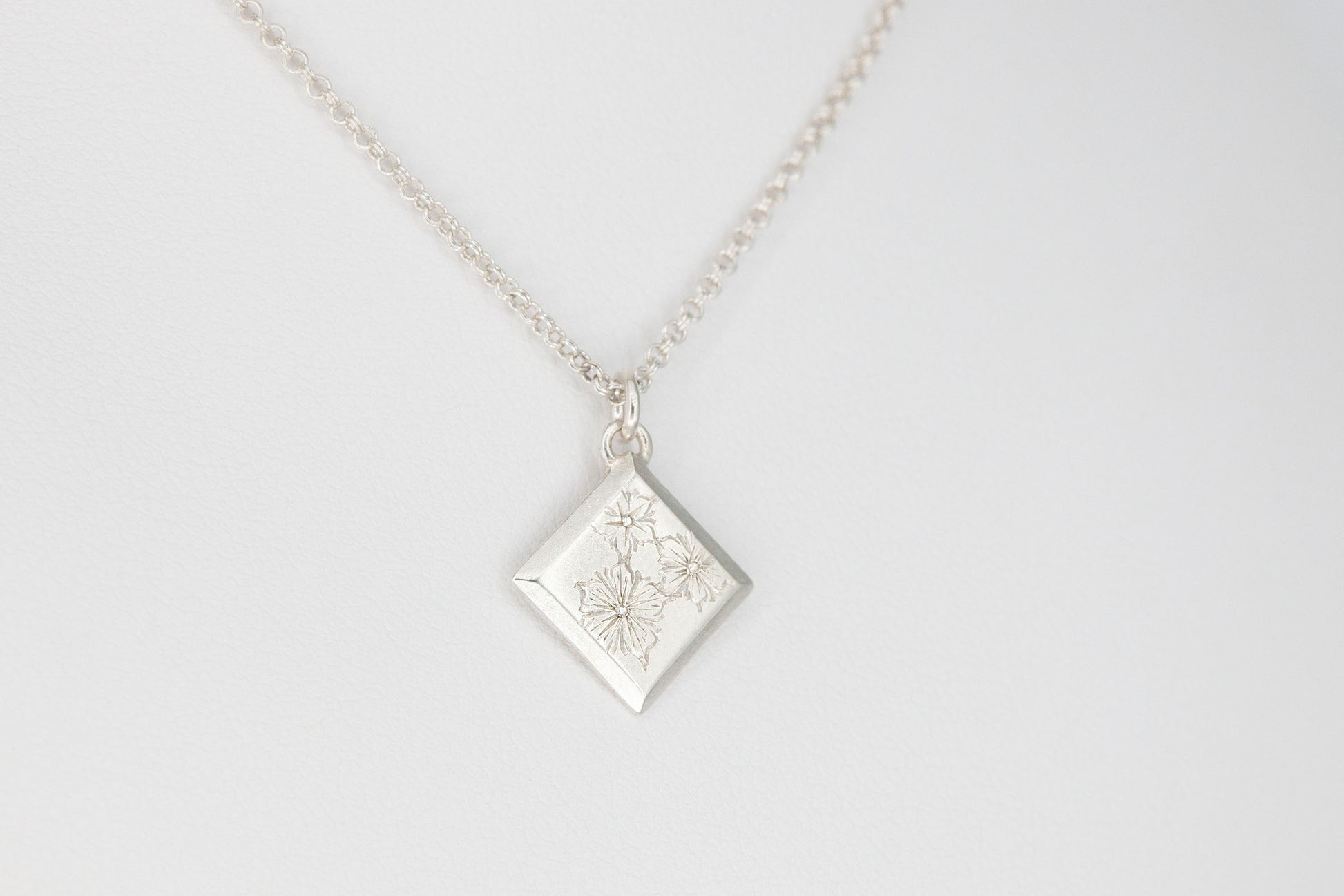 This elegant sterling silver necklace has a dainty yet durable double cable chain which carries a hand-cut pendant with wildflowers hand-engraved* on the surface, providing beautiful sparkly detail that is sure to bring you the happiness of spring emerging after a cold winter and have you dreaming of smelling the fresh air as you stroll past a field bursting with flowers...